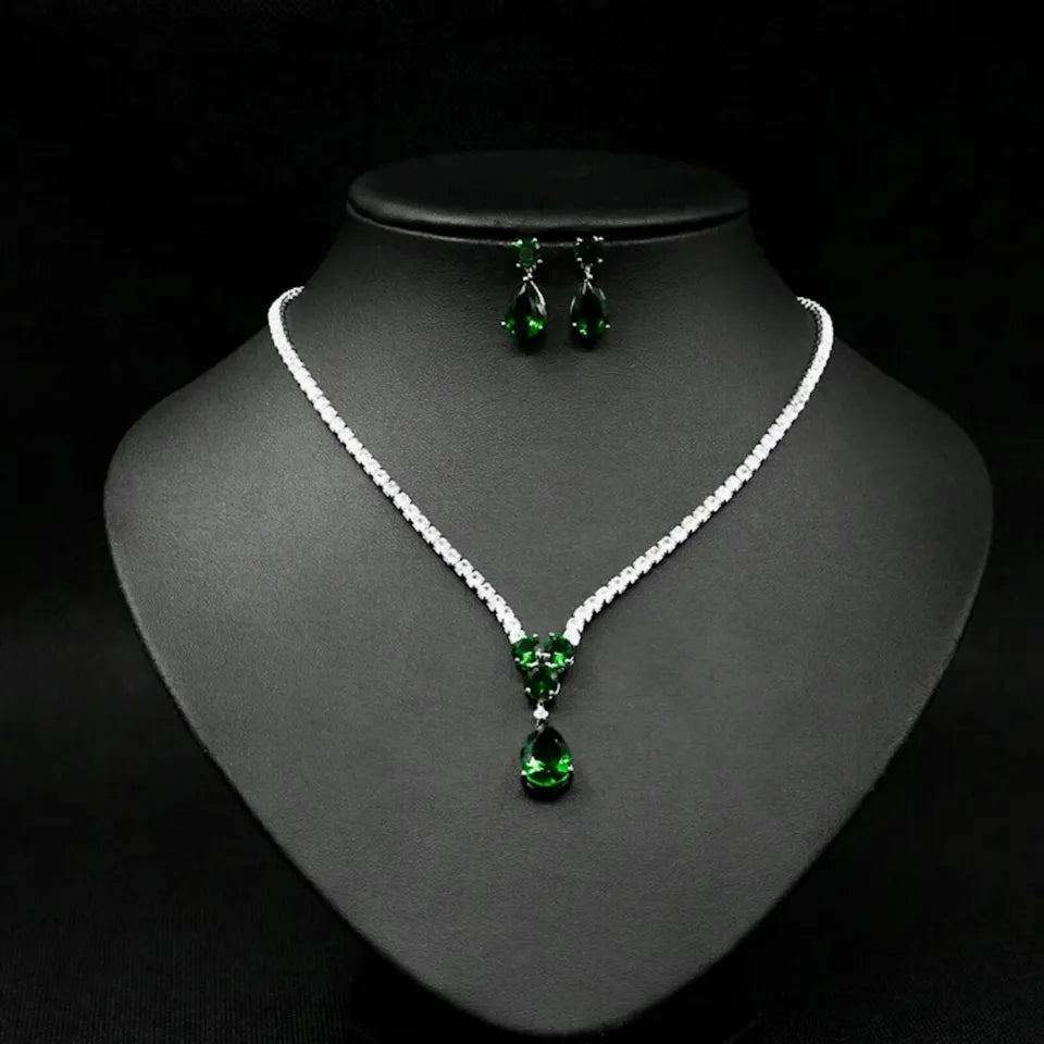 18k Platinum Green Emerald Tennis Necklace Earrings Set