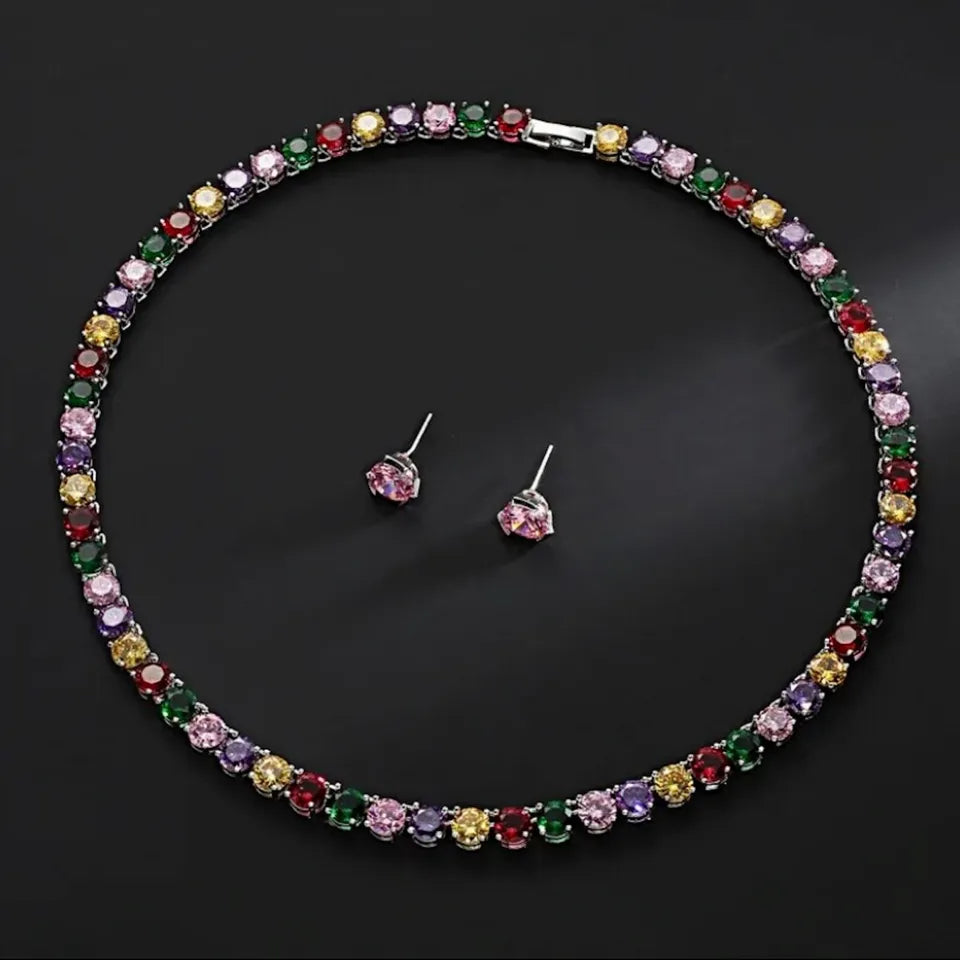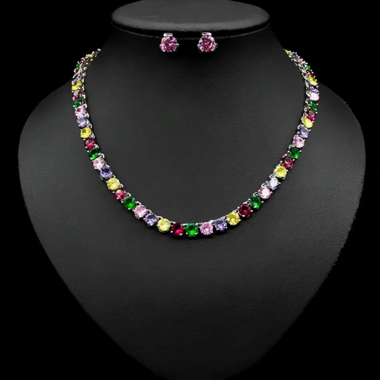 18k Platinum Multicolor Sapphire Tennis Necklace Earrings Set